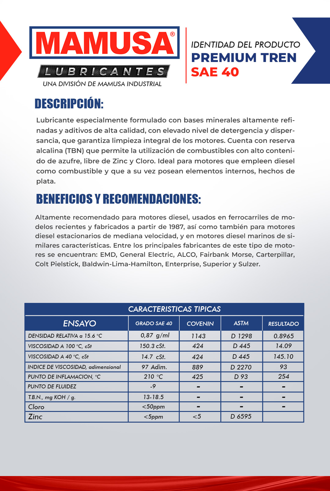 Lubricante especialmente formulado con bases minerales altamente refi- nadas y aditivos de alta calidad, con elevado nivel de detergencia y disper- sancia, que garantiza limpieza integral de los motores. Cuenta con reserva alcalina (TBN) que permite la utilización de combustibles con alto conteni- do de azufre, libre de Zinc y Cloro. Ideal para motores que empleen diesel como combustible y que a su vez posean elementos internos, hechos de plata.